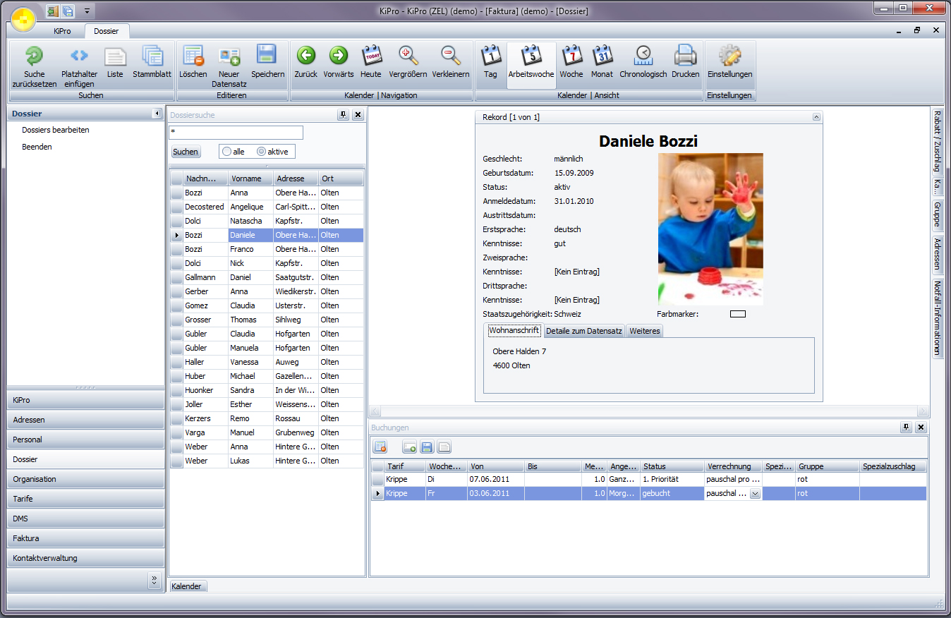 In diesem Modul werden die Dossiers geführt. Neben den persönlichen Da-ten wie Geburtsdatum usw. können verschiedene Bereiche wie z.B. Gruppe, Bezugspersonen, Rechnungsempfänger, Notfall-Informationen, Rabatte und Zuschläge u.v.m. erfasst und verwaltet werden.