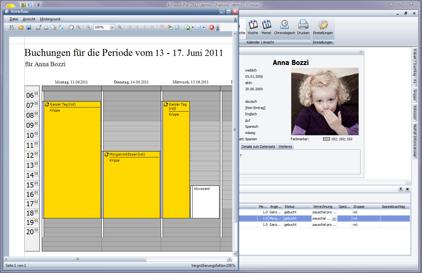 In diesem Modul werden die Dossiers geführt. Neben den persönlichen Daten wie Geburtsdatum usw. können verschiedene Bereiche wie z.B. Gruppe, Bezugspersonen, Rechnungsempfänger, Notfall-Informationen, Rabatte und Zuschläge u.v.m. erfasst und verwaltet werden. Die Angebotsnutzung wird ebenfalls in diesem Modul erfasst und kann im Termin- und Buchungskalender angezeigt und ausgewertet werden.