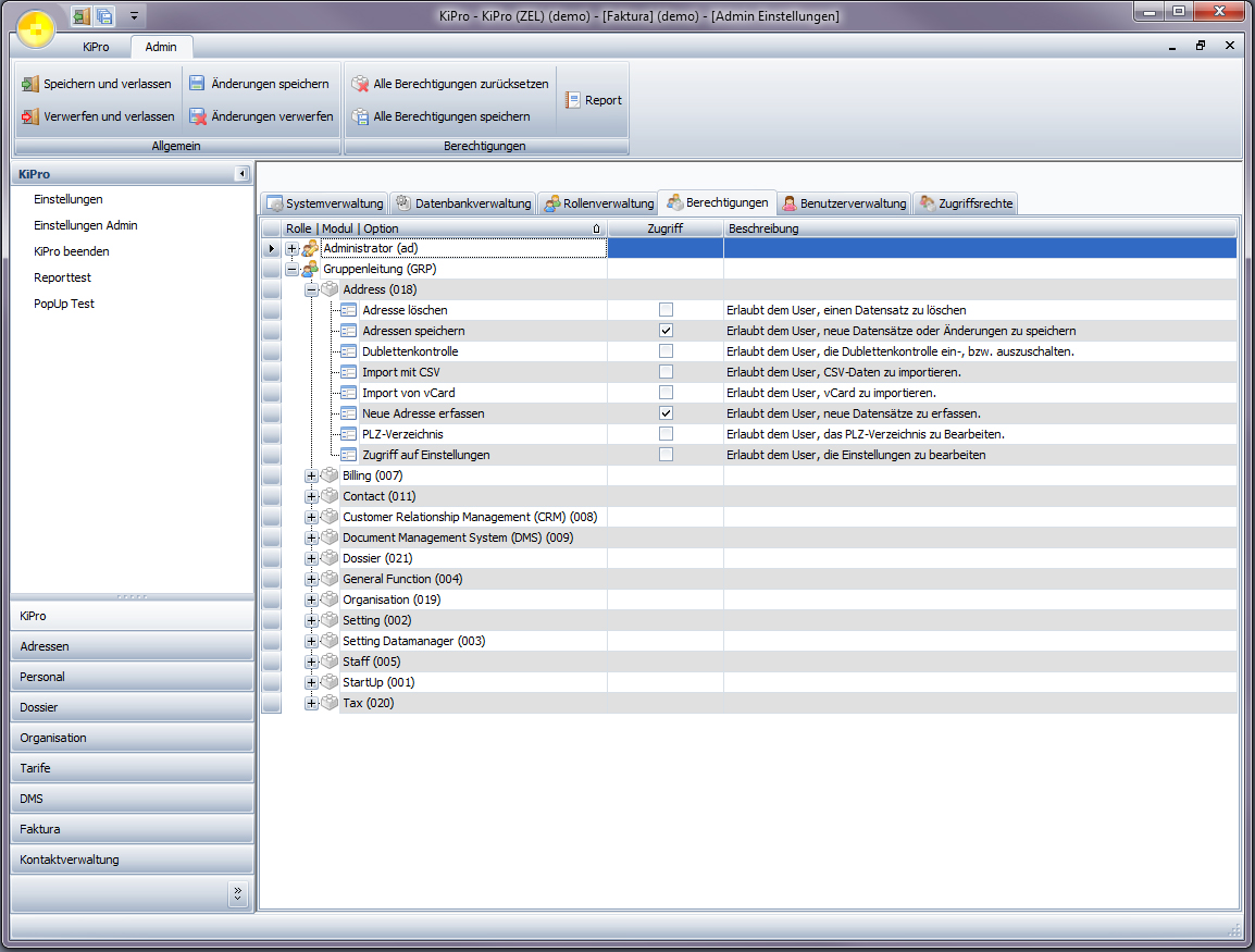 In diesem Bereich können sämtliche zentrale Einstellungen der Software erfasst werden. Ein separater Kennwortschutz sichert dabei den Zugriff. Hier werden Benutzer und Zugriffsrechte bearbeitet, neue Datenbanken (Microsoft SQL Server) erzeugt und Modulberechtigungen bereitgestellt.