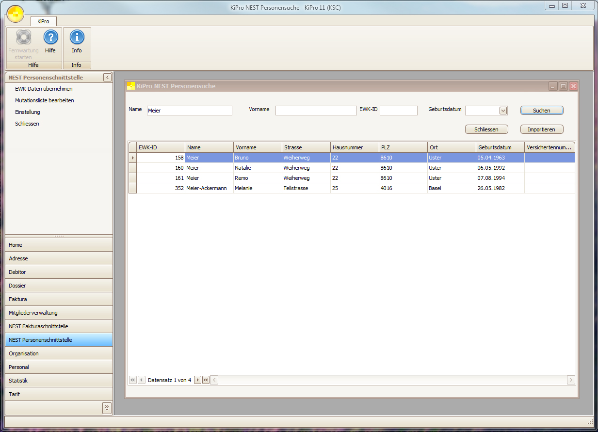 Wenn KiPro 11 im Umfeld der öffentlichen Verwaltung eingesetzt wird, kann zur Übernahme der Daten aus der Einwohnerkontrolle das Modul nest Person eingesetzt werden. Als Umsystem von nest übernimmt KiPro 11 die EWK-ID und sorgt mit der Mutationsqueue dafür, dass Adressänderungen aus der Einwohnerkontrolle automatisch übernommen werden.
